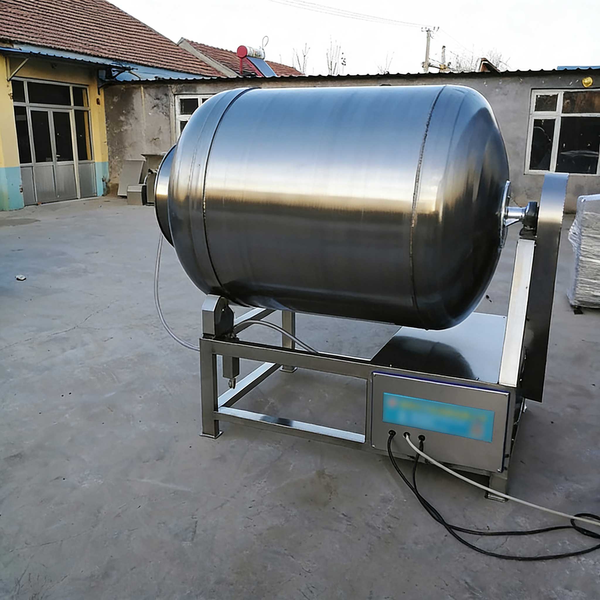 Vacuum Tumbler, Curing Machine, Meat and Bone Stick Curing MachinePerformance:The vacuum tumbling machine operates under vacuum conditions, utilizing the principle of physical impact to allow meat pieces or meat paste to tumble up and down within the drum, achieving marination. The marinating liquid is fully absorbed by the meat, enhancing its binding and water-holding properties, and improving product elasticity and yield. This machine is made of stainless steel, features a circular head, has a reasonable structure, a large tumbling space, stable operation, low noise, reliable performance, simple operation, and high equipment efficiency. The paddle blades are curved, with a unique design that ensures even distribution of the marinade, causing no damage to the product's surface, and enhancing the tenderness and appearance of the product.