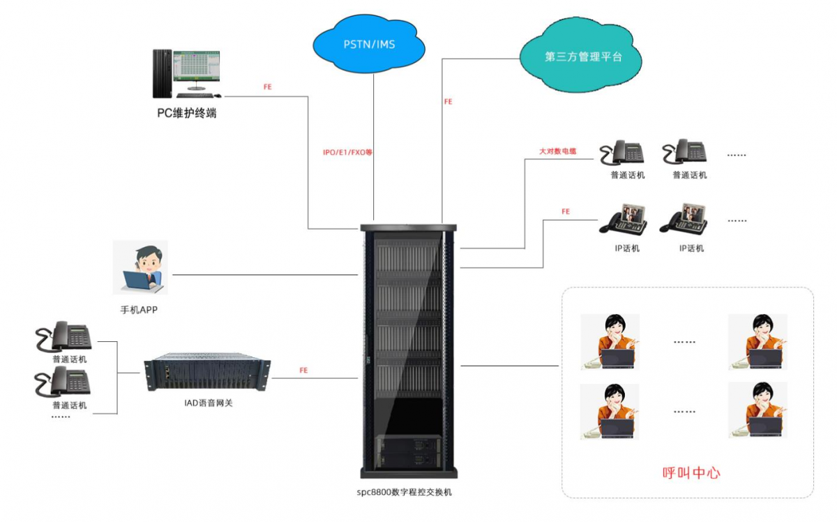In response to customer needs and leveraging our past work experience, this solution is based on voice communication functionality, with the development of IP networks as the business core. Designed with an integrated, intelligent, and convenient management philosophy, it combines multiple application modules such as IP networks, traditional telephone networks, and third-party application platforms to achieve the required call center functions. The system utilizes a new-generation digital switching exchange from Xiong Bao Technology as the core switching equipment, coordinating with various communication terminals of users to form a network.