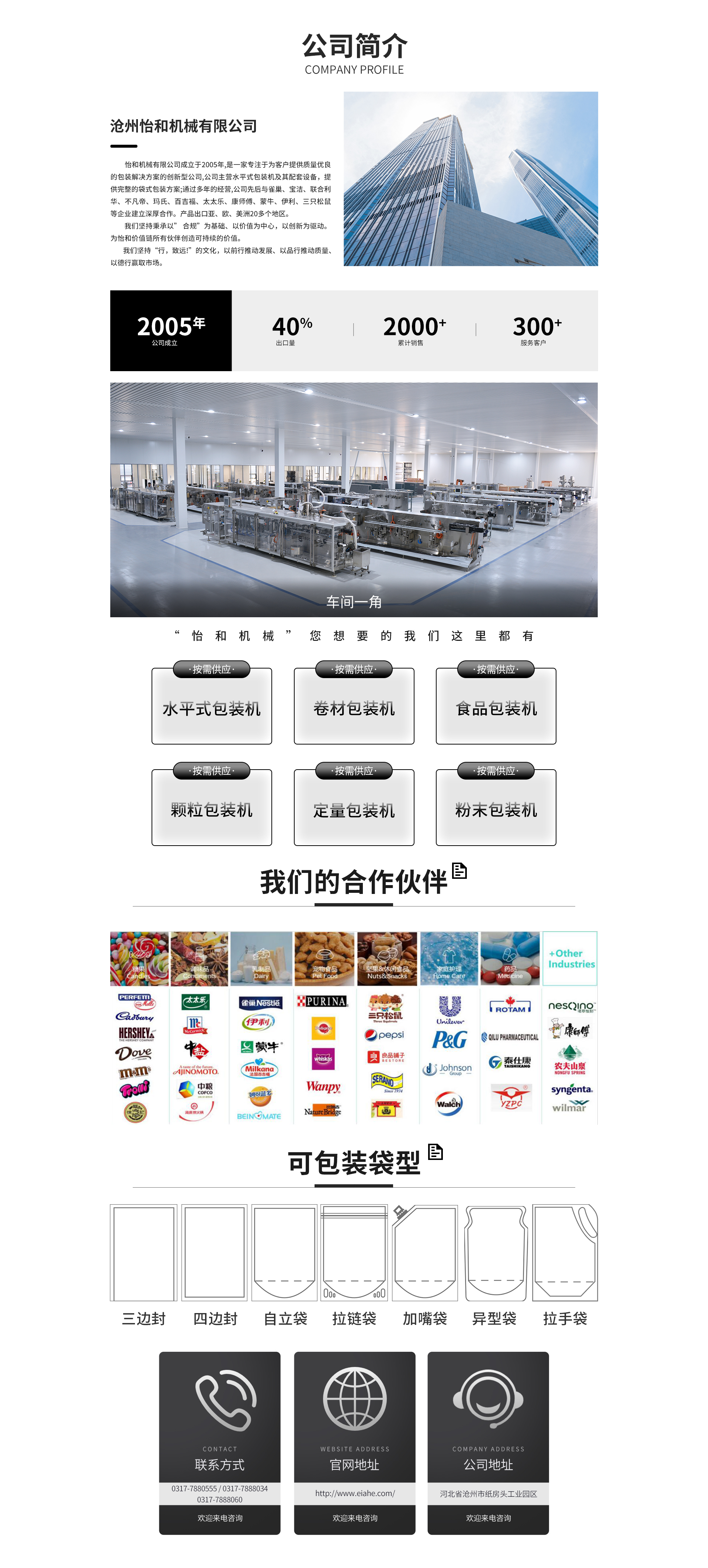 Yihe Machinery Co., Ltd. was established in 2005 and is an innovative company dedicated to providing high-quality packaging solutions to clients. The company specializes in horizontal packaging machines and their accessories, offering comprehensive bag packaging solutions. Over the years, the company has established deep partnerships with Nestlé, Procter & Gamble, Unilever, Ferrero, Mars, Bic,太太乐, Master Kong, Mengniu, Yili, and Three Squirrels, among others. Our products are exported to over 20 regions in Asia, Europe, and the Americas.We are committed to upholding compliance as the foundation, value as the core, and innovation as the driving force. We strive to create sustainable value for all partners in the Yi Yi value chain.We adhere to the cultural philosophy of "Action leads to distant goals!"—using action to drive development, character to enhance quality, and integrity to win the market.