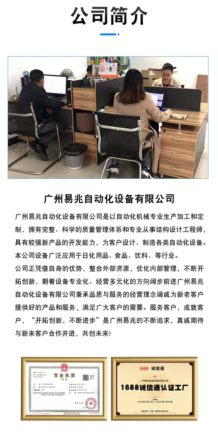 Guangzhou Yizhao Automation Equipment Co., Ltd. specializes in the professional production, processing, and customization of automation machinery. We boast a comprehensive and scientific quality management system and have structural design engineers with strong capabilities in developing new products. We design and manufacture various types of automation equipment for our clients. Our equipment is widely used in industries such as daily chemicals, food, beverages, and more. Leveraging our strengths, we are integrating external resources, optimizing internal management, and continuously innovating, advancing towards specialization in equipment and diversification in business. Guangzhou Yizhao Automation Equipment Co., Ltd. adheres to the business philosophy of quality and service, sincerely providing excellent products and services to new and old customers to meet their needs. Serving our clients and achieving with them, "pioneering innovation and continuous progress" is Guangzhou Yizhao's relentless pursuit. We sincerely look forward to collaborating with new clients and moving forward together, creating a future!