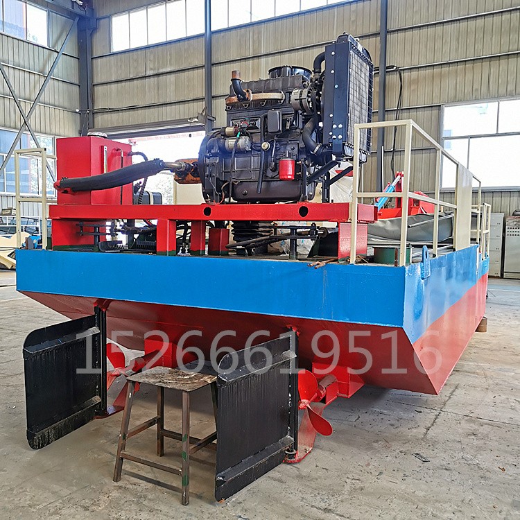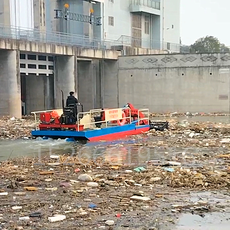 ⑴Mowing barge, also known as surface cleaner vessel,Our company has developed and refined this multi-functional equipment over many years, which excels in harvesting, collecting, and cleaning a variety of aquatic plants and floating debris. This vessel utilizes the harvesting and collection device at the bow to effectively manage the waterborne elements.5 feetGrass and floating debris on the water surface are harvested and collected into the storage hold. Once the storage is full, the vessel docks at the riverbank, and then the top-lifting device of the storage and conveying system is used to elevate the storage conveying chain assembly to the required height, conveying the cleaned weeds onto shore.