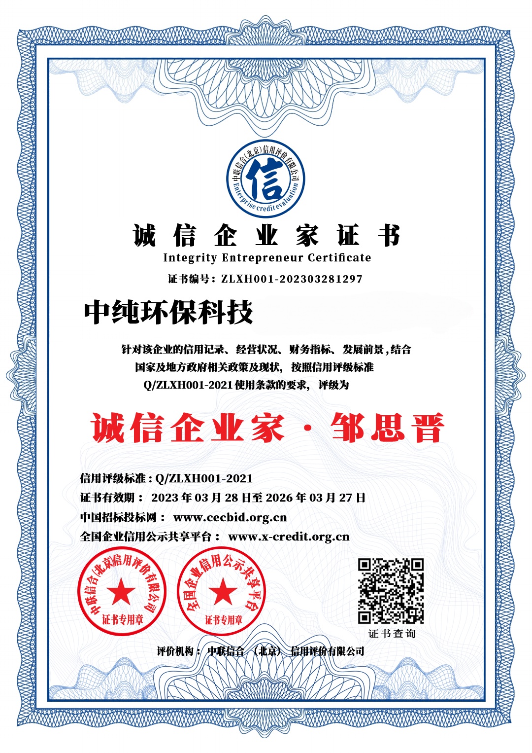 诚信企业家-邹思晋_Honor Qualification Co., Ltd._Zhongchun Environmental Protection Technology (Suzhou) Co., Ltd._Zhongshang 114 Industry Resources Network