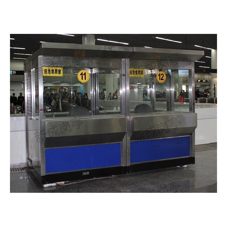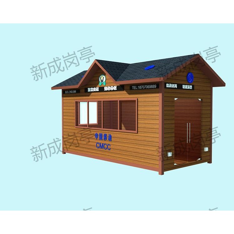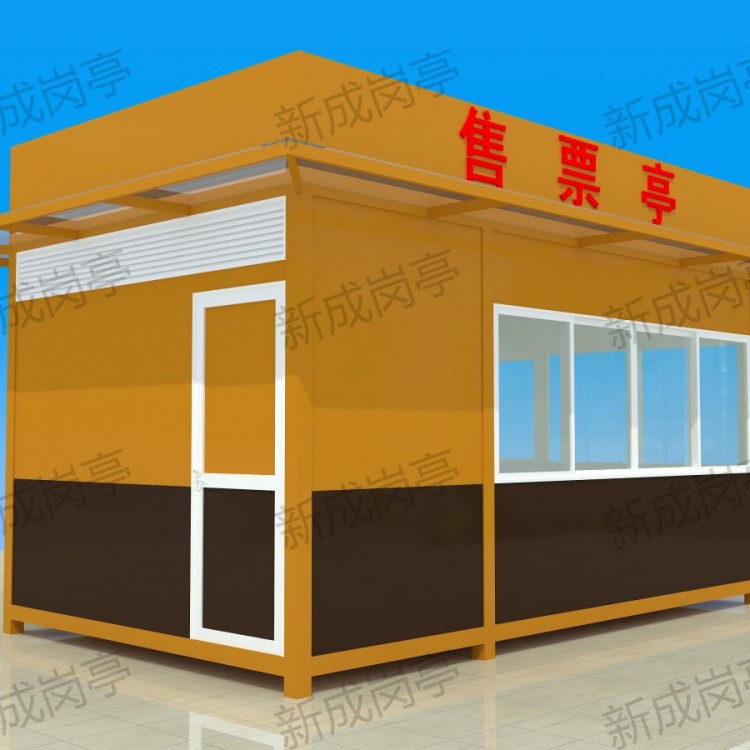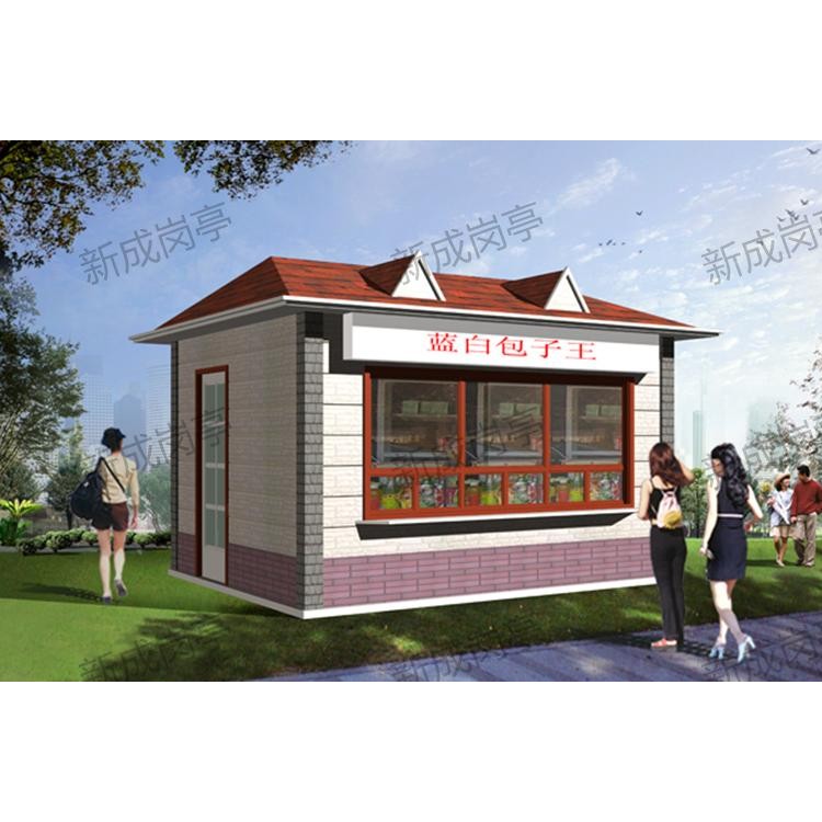 表面喷涂汽车金属漆。售货亭柱:立柱采用方形钢管拼接,表面喷涂汽车金属漆。售货亭特点:人性化设计:针对不同用途的亭子设计相应的结构空间和配备合理的配置。售货亭地面地板采用高速公路收费亭的防静电地板;底部为镀锌钢通作为骨架结构;售货亭内电器电器严格按照GB5226.1-2008标准设计,亭内配有五孔插座、日光灯盘、开关、插座等;亭内所有线路套管在夹层中隐藏,此设计合理,检修方便。售货亭具有特级的防火、防水、防台风、隔音、隔热、环保、等功能,是您值得信赖的工作和休息的栖身之所,东莞宏晟售货亭设计理念:把新的材料和精巧的结构组合成整体的现代化之美。产品可根据用户使用环境的实际情况选用材质与配件,进行定制。