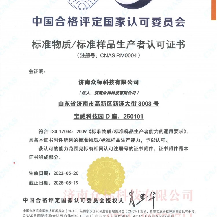 标准物质/标准样品生产者认可证书CNAS RM0004