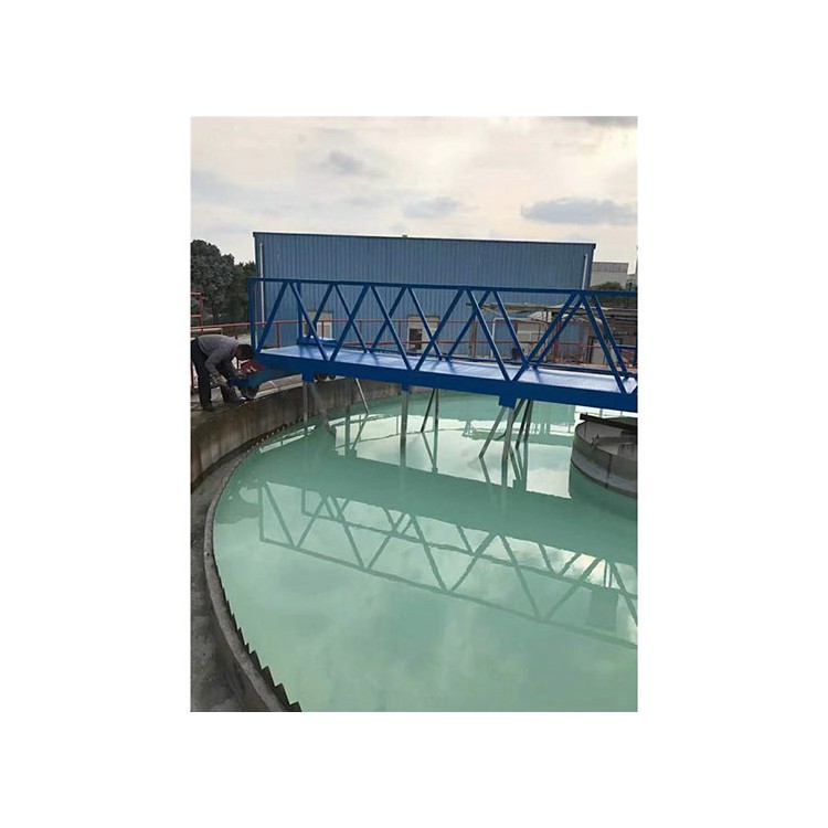中心支座由固定支撑座、回转轴承和桥架组成,可同时承受轴向力、径向力和倾覆力矩。集电装置采用滑环式集电装置,由集电环和电刷架组成。浮渣刮板、浮渣耙板、浮渣漏斗组成排渣机构,能有效地清除水面浮渣。工作桥是连接中心支座和行走端梁的大型部件,其上有走道板和栏杆,钢梁的下面连接刮泥结构、排渣机构等,在行走装置的带动下来完成刮泥、排渣工作。