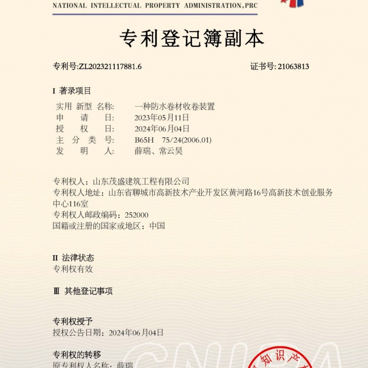 专利登记薄副本