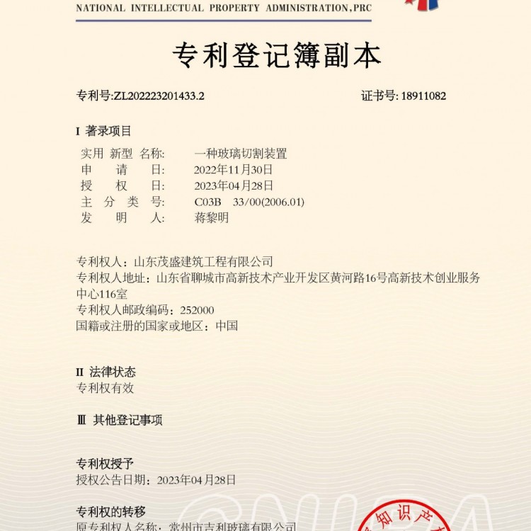 专利登记薄副本
