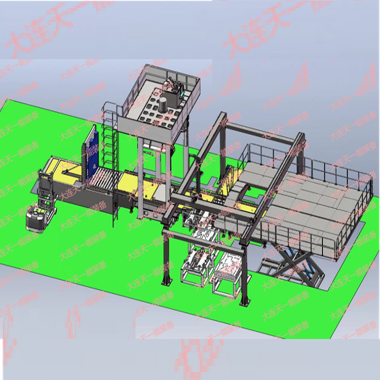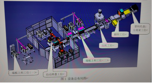 本生产线由上料工位(自动或人工)、自动叠堆工位、定位杆安装定位(人工),螺栓安装工位、电堆压合及螺栓拧紧工位及翻转工位等组成,采用的是AGV(或人工)运输与机器人组合的智能化方式,AGV(或人工)自动上料,机器人自动抓取单片堆叠,人工穿定位杆,机器人抓取、安装螺杆,辊道输送,压机压紧,机器人自动拧紧螺栓等工序完成电堆产品的生产,自动化程度高,电堆生产线的布置采用直线型工位布置方式,充分考虑车间面积的利用率,优化生产和转运效率