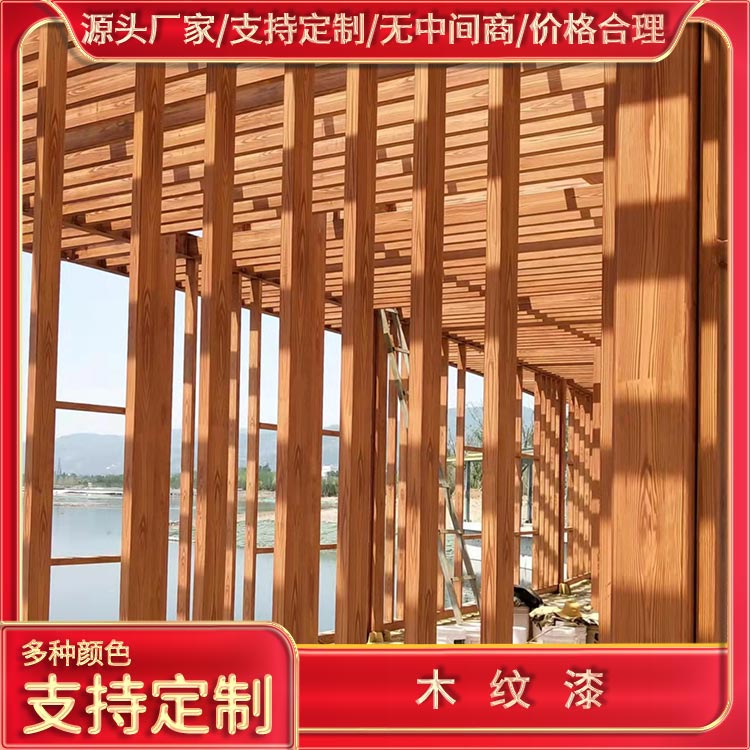 Wood grain paint, also known as simulated wood grain artistic paint, utilizes professional techniques to manually create a natural-looking wood effect through color coordination. It can be easily adapted to various settings, widely used on metal materials such as steel structures, square steel, stainless steel, galvanized pipes, aluminum channels, etc. It's also suitable for presenting wood grain effects on structures like pergolas, pavilions, railings, garages, billboards, windows, doors, and concrete wall surfaces! It can maintain its appearance outdoors for 8-15 years without fading, peeling, or cracking!