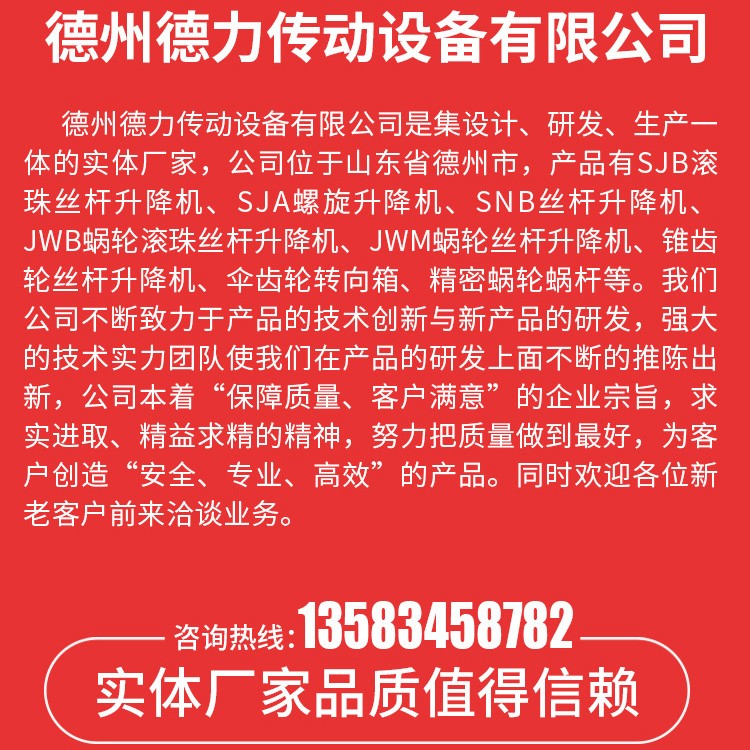 Screw jack (Spiral lifting jack))A mechatronic motion execution unit ingeniously combines the motor, reducer system, screw transmission, etc. It can be used individually or in combination with multiple units, pieced together like building blocks with right-angle turners, couplings, and connecting rods, enabling precise control of the lifting, reciprocating, and flipping movements of the mechanism. This unit, predominantly featuring worm gear and screw lifters, can replace traditional hydraulic and pneumatic transmission in various applications. It provides a broad design space for engineers to develop products in today's digital era. This series...ScrewThe hoist features an automatic locking mechanism.Utilizing a unique square groove shell design, enhancing the shell's heat dissipation capabilities, and extending the service life of lubricating grease. The choice of nodular cast iron for the shell material significantly boosts the shell's strength and performance, as well as its resistance to high temperatures./Widely applicable at low temperatures. Square tail cover design prevents the lead screw from rotating freely. Advanced processing equipment and assembly techniques ensure high-quality products. Cutting-edge design concepts create products with strong impact resistance, high strength, low noise, long service life, and compact size.Widely used in various industries such as solar energy, metallurgy, food, and water conservancy.Safety nut design, monitors product wear condition, eliminates potential hazards, and can be combined with reducers and various accessory modules to meet any customer requirements.