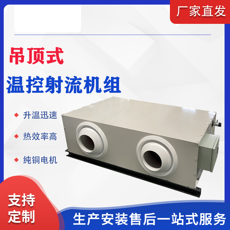 Highceiling spaces with spacious areas are preferable. The remote jet air conditioning unit mainly consists of cabinet frame, air filter, evaporator, fan, spherical nozzle, and connecting components.