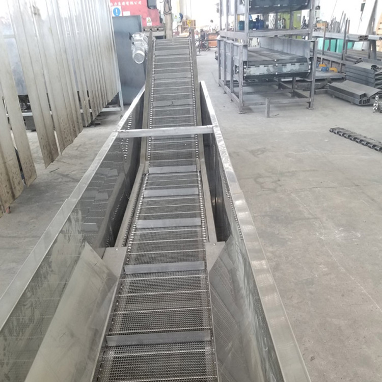 Chain plate conveyors have a high conveying capacity, long conveying distance, and can also complete several technical operations during the transportation process, making them widely used. This conveyor is designed for material transportation. Made of stainless steel chain plates, it is suitable for drying, dehumidifying, freezing, and heat treatment in various food industries; it is made of stainless steel, featuring high-temperature resistance and ease of cleaning; the specific dimensions of the conveyor can be customized according to customer requirements. It is mainly used in various food industries, high-temperature processing industries, etc. The chain plate conveyor belt is a mechanical conveying device that transports materials continuously by friction drive.