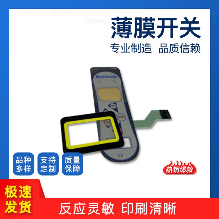Film switches, panel-mounted switches with keys, panel functions: integrated with graphics, markings, transparent windows, and indicator lights, and featuring a multi-layer overall sealing structure. Thus, it boasts features such as wear resistance, waterproofing, dustproofing, protection against harmful gases, long lifespan, and stable performance. For the overall cleanliness of the unit, the panel is washable without damaging the characters, with rich colors and good preservation, and easy installation. Moreover, the application of film switches and panels further highlights the unique, carefully crafted design of your product's functions and colors, enhancing the product's appearance quality and modern feel.