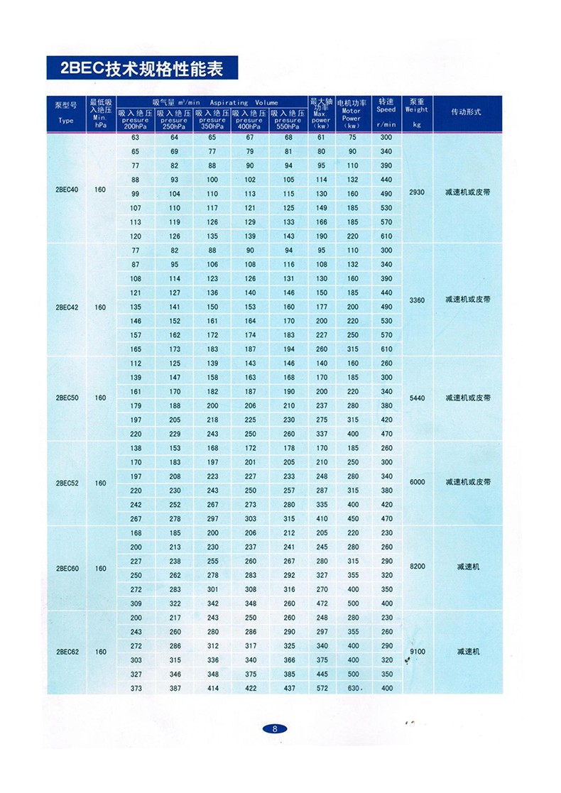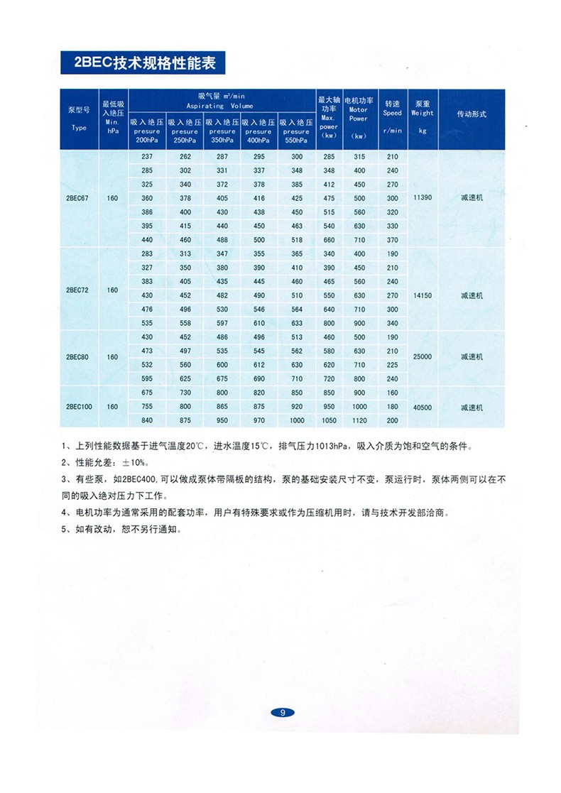1. The 2BE water ring vacuum pump is capable of long-term continuous operation within the ambient temperature range of 5-40 ℃ and under inlet pressure less than 1330Pa.