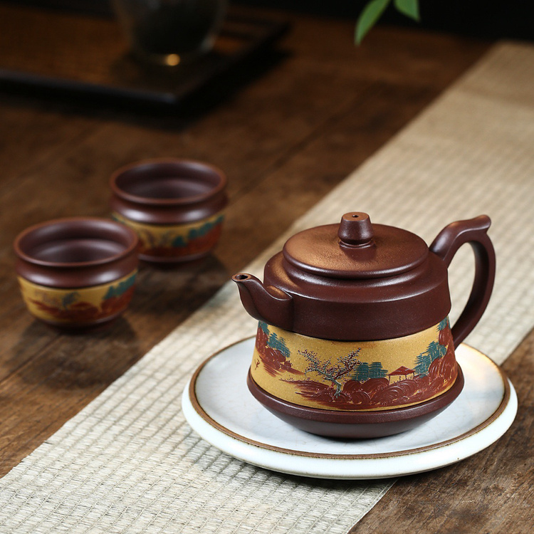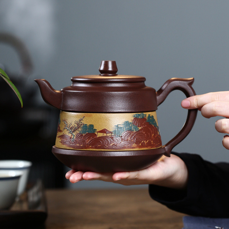 This piece is crafted from natural materials, featuring a unique design, graceful lines, and endless artistic charm. The clay is smooth, the craftsmanship intricate, and the shape upright. The pot-making artistry excels in conception and execution, effortlessly achieving an elegant and spontaneous charm. The pot's expansive scene is captivating, endowing viewers with a sense of auspiciousness and richness. The meticulously detailed landscape paintings around the pot, with their varied brush strokes and colors, vividly depict the scenery. The brushwork is delicate, lifelike, and the landscape layout is exquisite. The mud painting uses colors with the right blend of intensity, immersing the viewer in a poetic, ancient scholar's realm. The pot can be rotated around its circumference, bringing prosperity and good fortune. The artist portrays the peace and prosperity under a flourishing era with an abstract style.