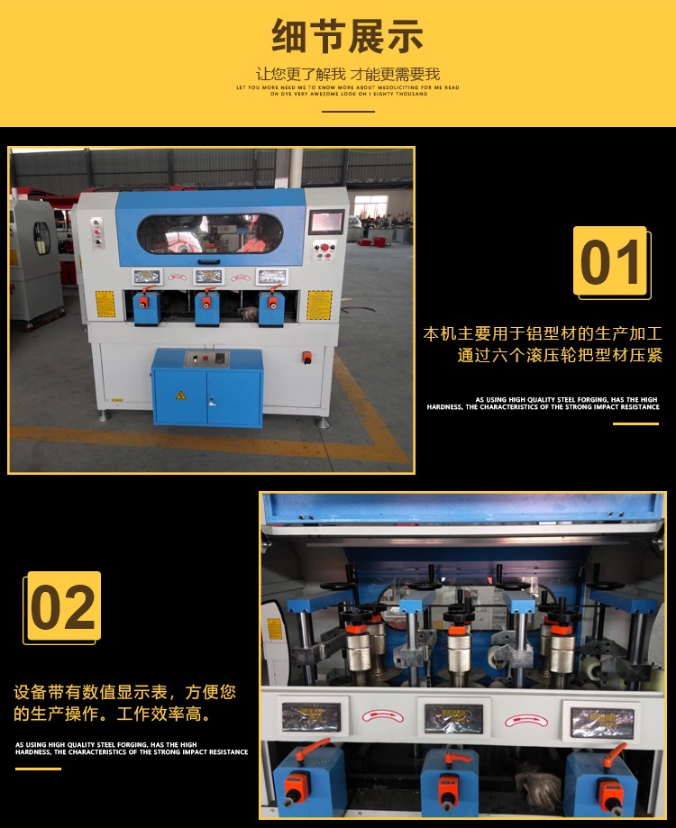 ●主要是将开完齿并穿好热条或塑料异材的断桥铝型材压合牢固,形成一整根断桥铝型材。