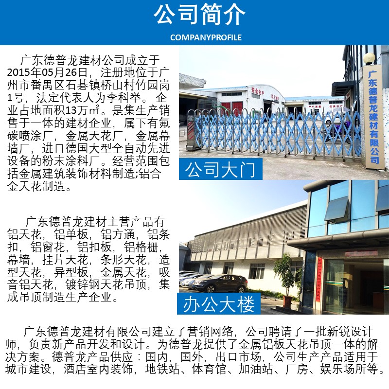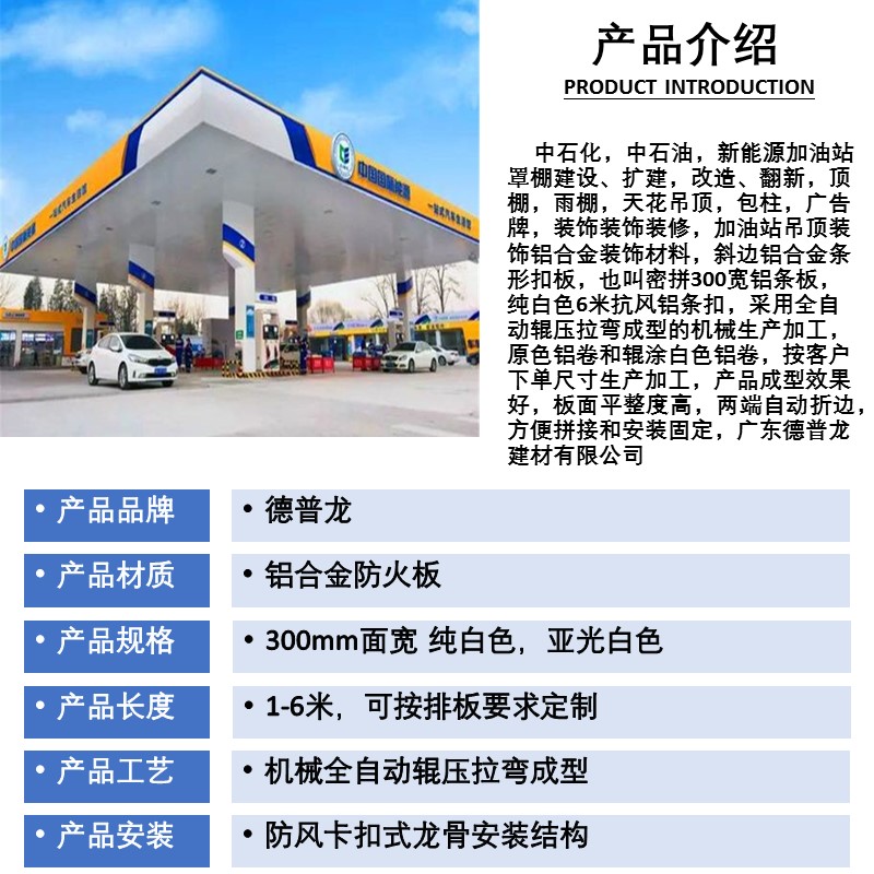 The trend of social development has led to the emergence of fire-resistant aluminum strips, significantly changing the exterior renovation of many gas station facades. With an increasing awareness of fire safety, the 300mm wide fire-resistant aluminum strip ceiling system features a tight and wind-resistant structure: installed with a special wind-resistant ribbed clip structure, offering high density and water resistance. Deppon is the ideal choice for many gas station owners. We offer customization in various specifications according to customer requirements. Please call for inquiries and procurement. 300mm wide fire-resistant aluminum strip ceiling system