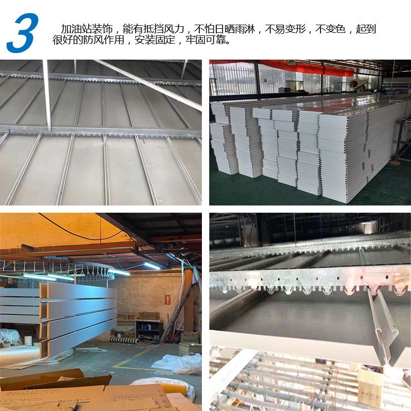 Sinopec, CNPC, CNOOC, Tianhai Petroleum, and various brands of gas stations, including new energy options.Gas station construction, expansion, renovation, redecoration, and the increasing awareness of fire safety are leading to upgrades across all stations. China石化, China石油, and local gas stations are gradually becoming widespread. The matte white anti-wind aluminum strip ceiling clip - 300mm wide long strip ceiling panel, hanging ceiling installation method, with many details such as aluminum strip clips, joists, T-beams, corner pieces, hangers, 50mm main joists, screws, etc. The materials used for the hanging ceiling include decorative materials. Generally, the hanging ceilings in gas stations are installed in a tight joint pattern, with aluminum strip panels and grooved joists, ensuring a secure fit and excellent wind resistance. Its durability, self-cleaning properties, and visual appeal play a decisive role in shaping the overall architectural image, transforming the gas station's new look.
