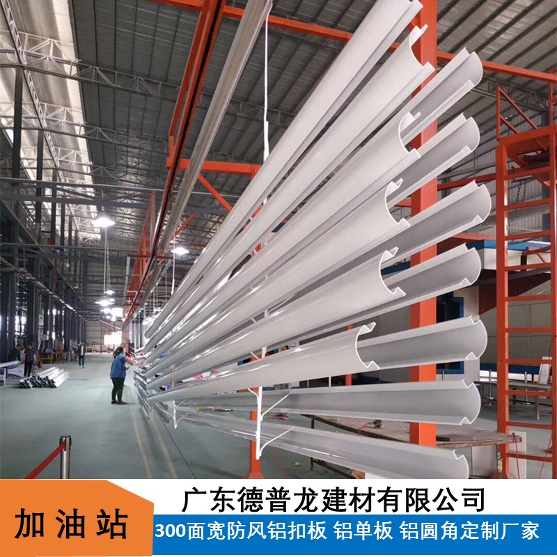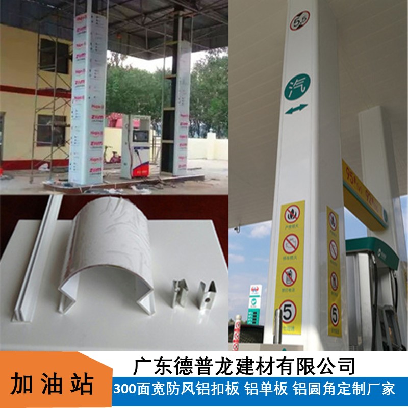 Curved design with scientific structure featuring strips and clips, columns in square and round shapes with high-gloss white finish, clean and aesthetically pleasing, high hardness aluminum profiles, ideal for decorative columns at gas stations.