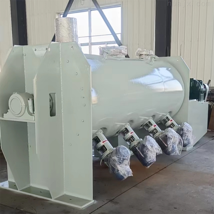 The mixer structure primarily consists of the transmission part, horizontal cylinder, plow blade assembly shaft, flying knife assembly, discharge valve, and spray unit, etc.