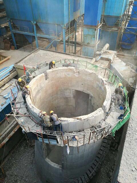 3. Chimney Siding: Scaffoldings are installed inside the chimney body, where workers carry out their tasks. They use an air compressor to break the material into smaller pieces, then cut the rebar with oxygen.