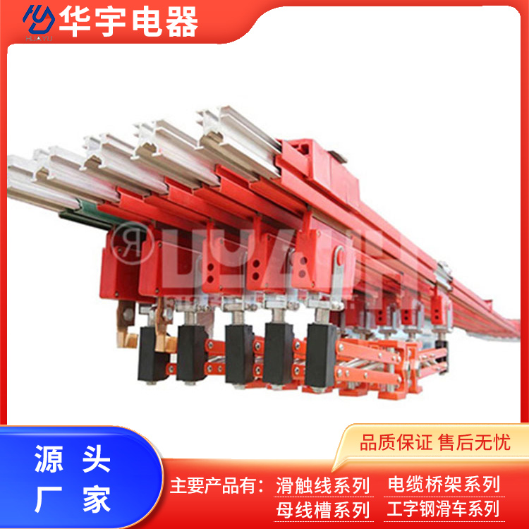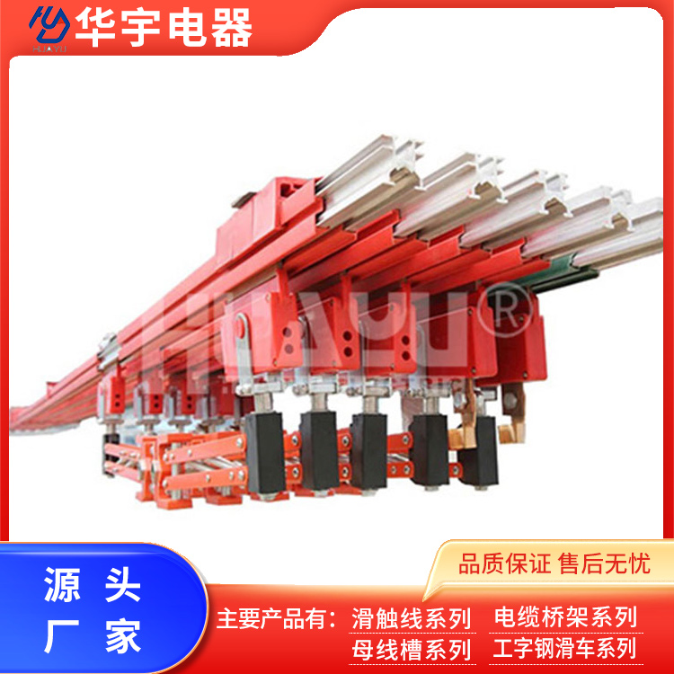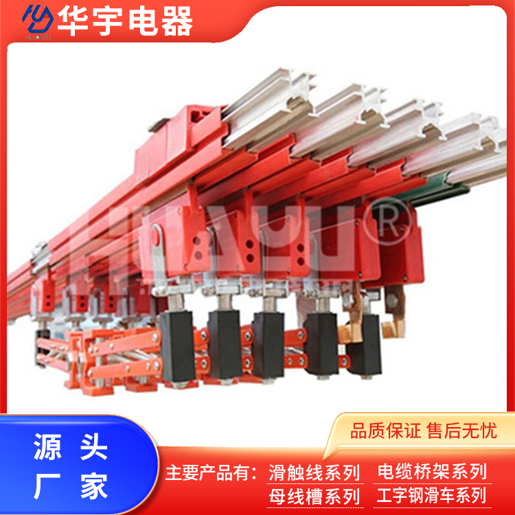 The heavy-duty three-section sliding contact wire conductor is made of aluminum extrusion, offering rigidity in both vertical and horizontal directions. It boasts a large surface area for optimal heat dissipation. The conductor is internally fitted with stainless steel strips for a highly durable contact surface. The sheath provides a protection level of IP23 for safety, and its design is waterproof and dustproof.