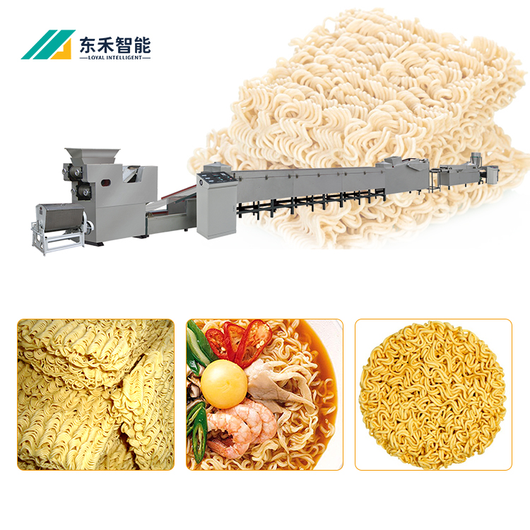 The instant noodle production line consists of a brine mixer, brine metering device, twin-shaft double-speed dough machine, disc maturing machine, compound calendering machine, multi-layer steaming machine, square noodle cutting and sorting machine, fryer, air-cooling machine, and conveyor.