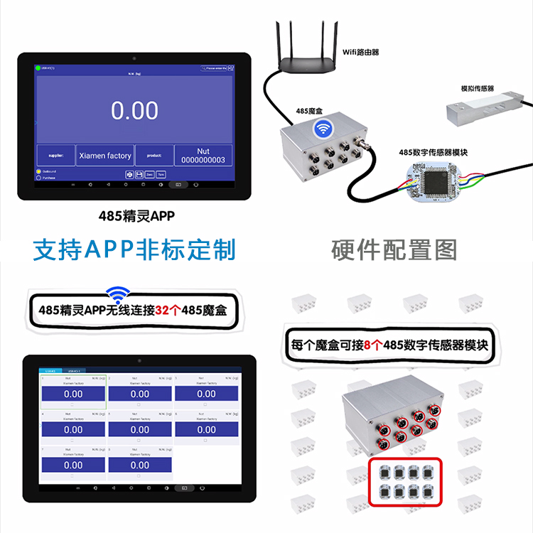 485 multi-channel weight transmitter connects to digital sensors, compatible with tablet computer APP software, capable of collecting 8 sets of digital scales per unit for weight counting and other application scenarios.