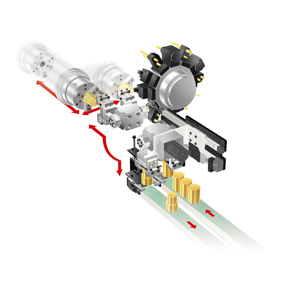 Equipped with a high-precision chuck lathe in a general-purpose lathe, featuring a loading head. The linkage between the loading head and the spindle significantly reduces loading time.