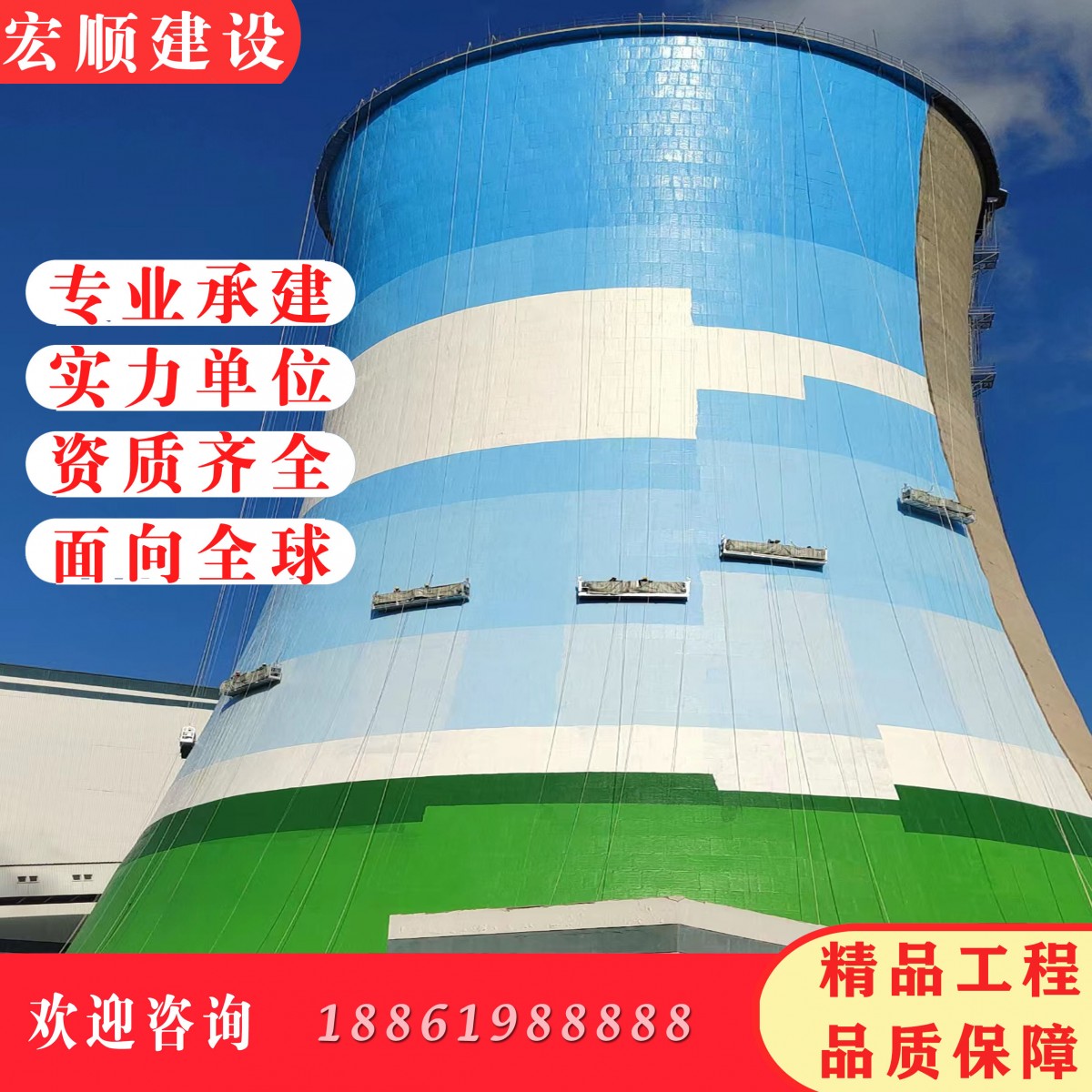 烟囱美化工程:高空装饰、烟囱美化、烟筒刷色环、烟筒刷航标、涂刷航空标志、刷航标色环、烟囱写字、烟囱亮化、烟囱外壁刷漆、烟囱粉刷色环、烟囱修饰装饰、水塔刷油漆写字、电厂双曲线冷却塔刷涂料画图、美化、装饰等;