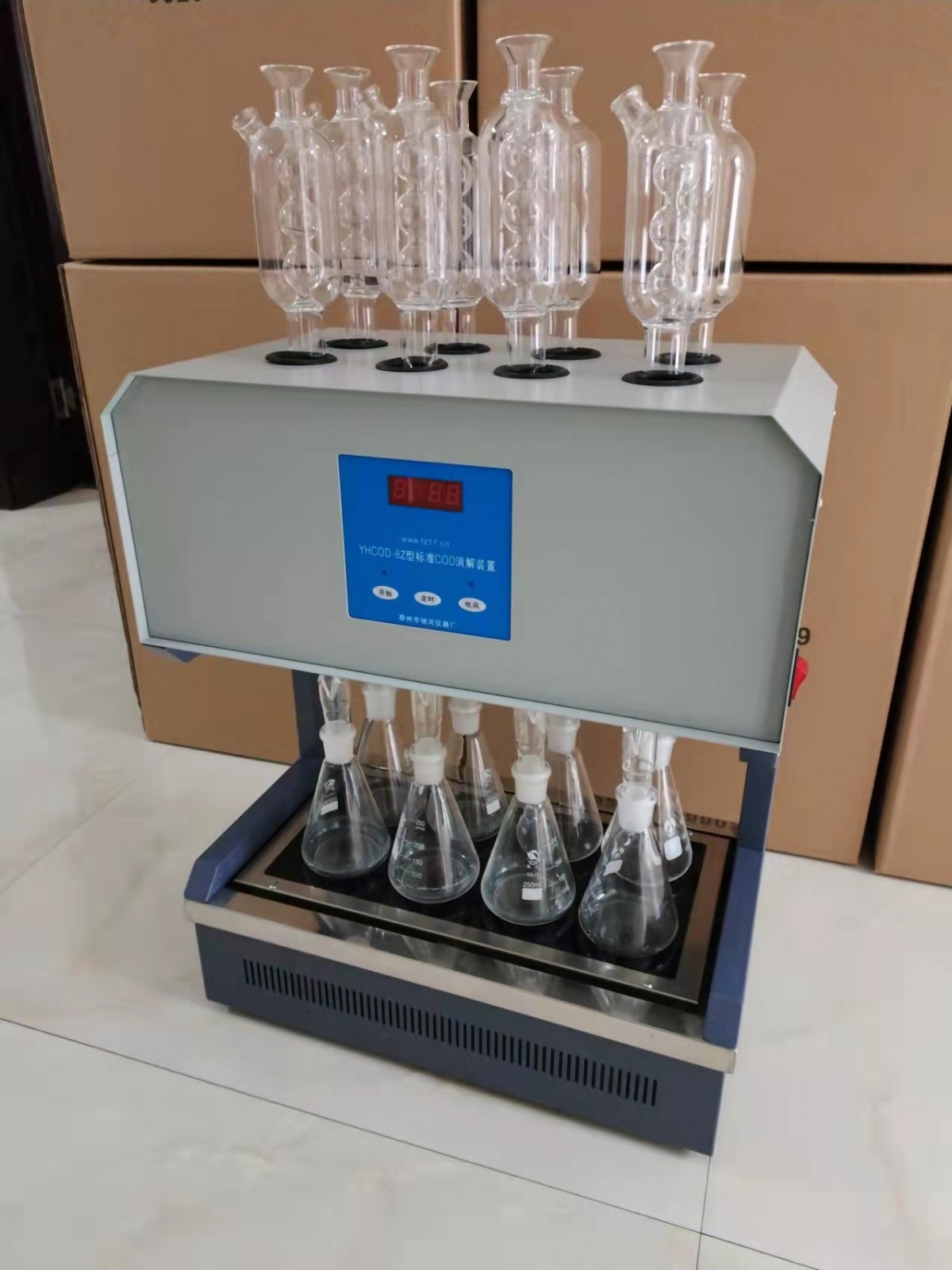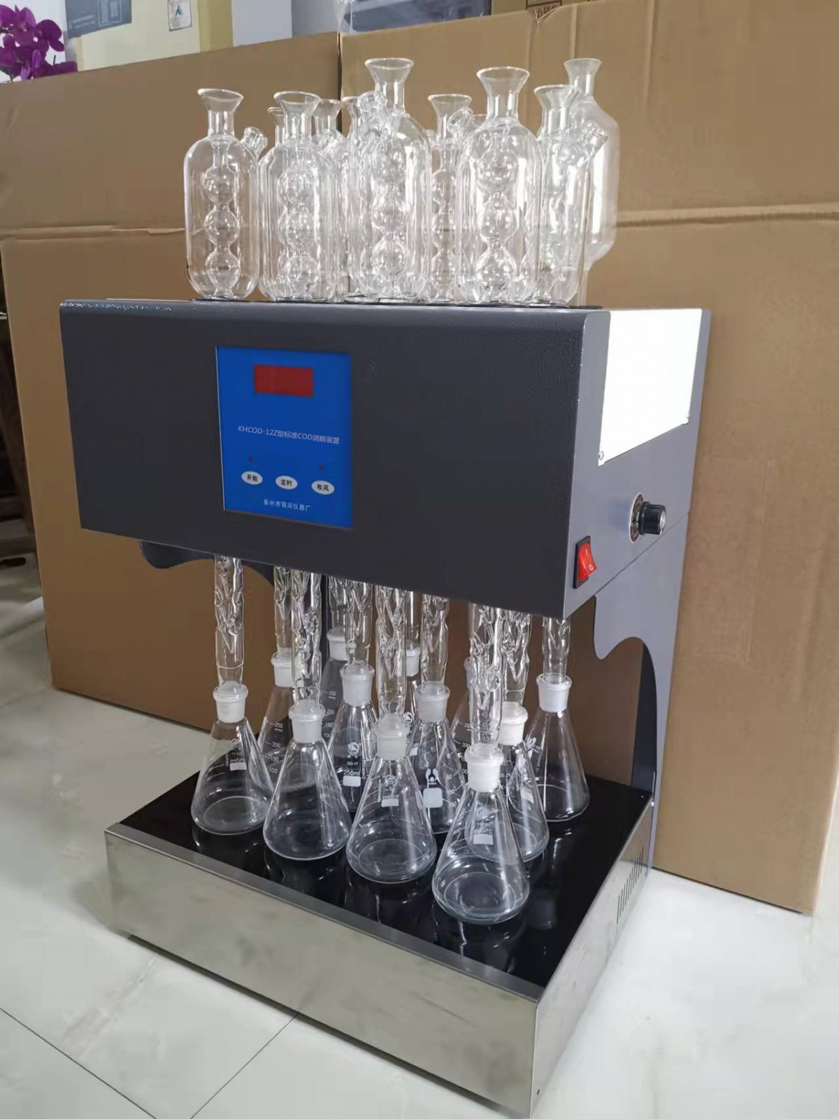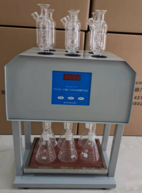 HCA-100Type StandardCODThe dissolver is mainly composed of the body, reflux tube, fan, electric furnace plate, etc.4Most components are equipped with microcomputer technology for timed control of the heating furnace plate and fan.6A conical flask reflux setup is heated simultaneously.
