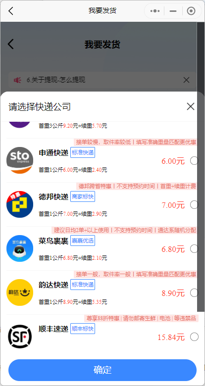 The CarrierNet mini-program partners with multiple courier companies, allowing you to compare prices and service quality among different firms on the platform and choose the courier that suits you best. Generally, price and service quality are two key factors in selecting a courier company.
