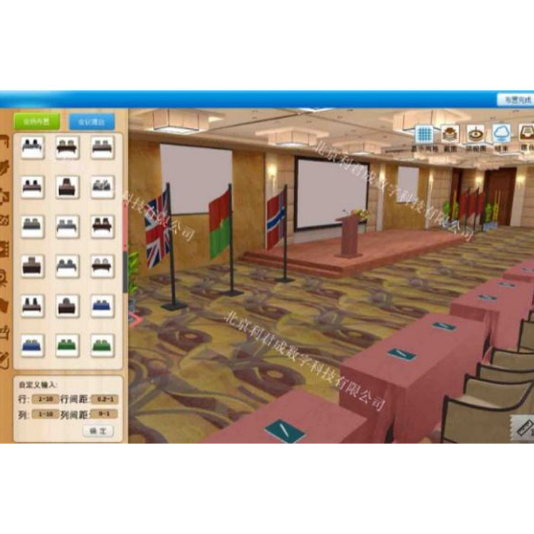 The Conference Service 3D Simulation Design Platform System is a 3D design software for planning and organizing conference events. It is divided into three major modules: conference seating arrangement, on-site conference setup, and micro-lessons on conference scenarios. It presents with 3D simulation micro-lessons, creative on-site design, and a 3D simulation training task system. In a 3D environment, it allows for overall on-site setup and seating arrangement for various types and themes of conferences. It fully utilizes students' creative design ideas and provides detailed explanations on conference types, composition, on-site services, welcome and registration services, conference living services, tea break services, seating arrangement, and on-site setup. Part of the content is viewed through 3D micro-lessons, and another part is trained through hands-on practical exercises, integrating learning, practice, and assessment to greatly meet the teaching requirements of conference service courses.