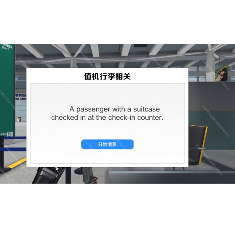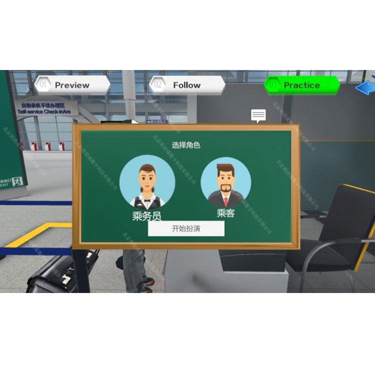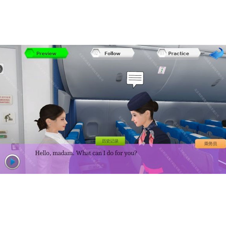 Our Civil Aviation English Virtual Simulation Teaching and Training System is a newly developed three-dimensional simulation training software specifically designed for civil aviation English oral listening and speaking training. The software realistically simulates classic English training cases in airport and cabin services through three-dimensional simulation and virtual reality techniques. It reproduces and再现s the service scenarios of airports and cabins in a three-dimensional manner, with the entire process conducted in an English-speaking environment. Students can practice in the system by listening, reading, repeating after, and role-playing, thoroughly exercising the English required for the service process. During the practice, the backend will make multidimensional judgments and statistics on the English speech, including scores, fluency, and speaking speed.