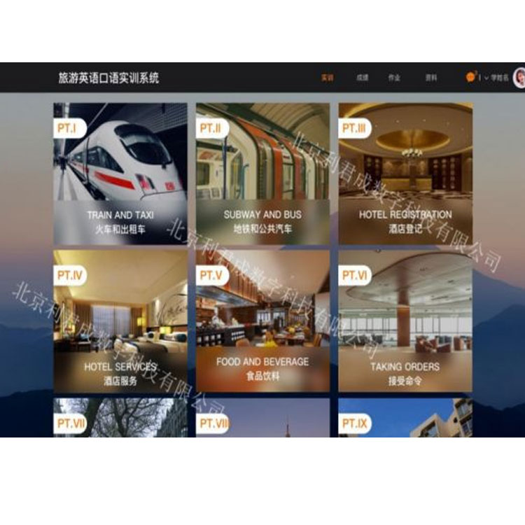 旅游英语口语实训系统根据旅游场合和角色不同,提供多种类型语料库,包括:TRAIN AND TAXI(火车和出租车)、SUBWAY AND BUS(地铁和公共汽车)、HOTEL REGISTRATION(酒店登记)、HOTEL SERVICES(酒店服务)、FOOD AND BEVERAGE(食品饮料)、TAKING ORDERS(接受命令)、RECREATION AND ENTERTAINMENT(休闲娱乐)、ConCERTS AND MUSEUMS(音乐会和博物馆)、GET-TOGETHERS AND PARTIES(聚会和社交)、MEETING TRAVEL(会议旅行)、EXHIBITION TRAVEL(展览旅游)、SHOPPING FOR CLOTHES(买衣服)、SHOPPING FOR COMPUTERS(购买电脑)等,通过模拟不同环境场景,使学生感受不同的旅游环节。