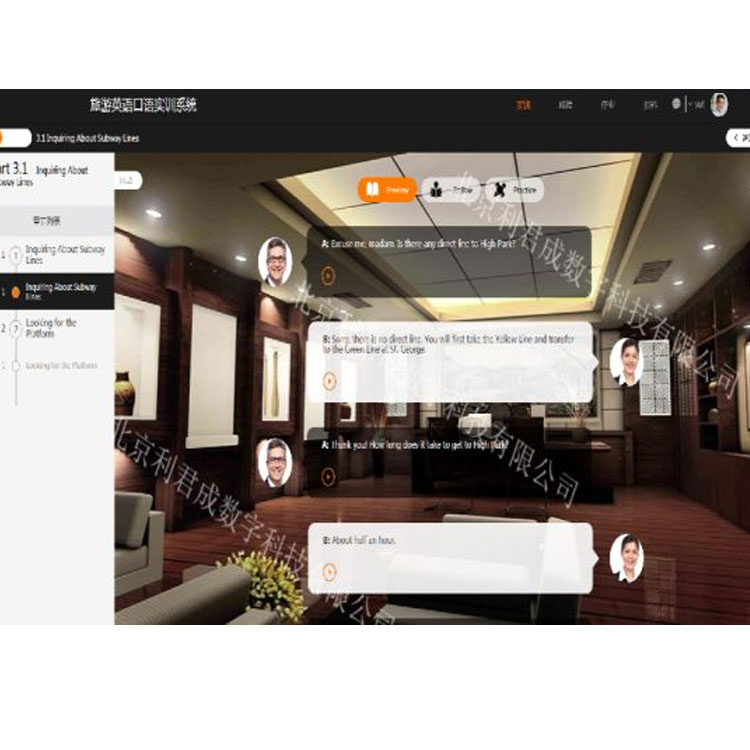 口语任务中通过实现“PREVIEW→PREPARE→PRACTICE”,预习、跟读、角色扮演等学习内容,学生根据情节需要扮演不同的角色,计算机则扮演对应的角色,进行人机交互,激发学生的兴趣,提高学习的乐趣,让学生在实训过程中深刻的体会在商务环境中的工作状态,并熟悉国外的文化及交流技巧,便于学生熟悉真正的工作流程及环境系统采用B/S结构,不需要安装客户端,满足学生随时随地进行学习的需求。