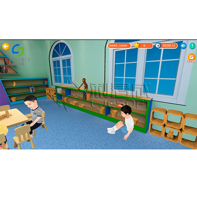 The system includes three functional modules: sensory integration, children's self-awareness, and safety prevention. It virtually simulates and embodies emotions, psychology, and safety-related content in children's growth process; primarily based on “3--6Content from the "Guidelines for Children's Learning and Development," tailored to the characteristics of children's activities, focusing on sensory integration disorders such as motor incoordination, attention issues, tactile reactions, writing problems, and spatial perception difficulties. It addresses children's self-awareness and preventive requirements in safety domains like fire safety, traffic, personal injuries, and natural disasters, providing professional curriculum resources and practical tasks for early childhood education students, enabling them to quickly grasp the content and essence of early childhood emotional and psychological education.