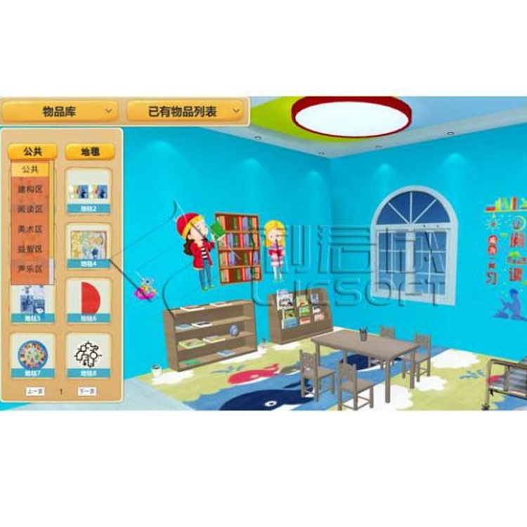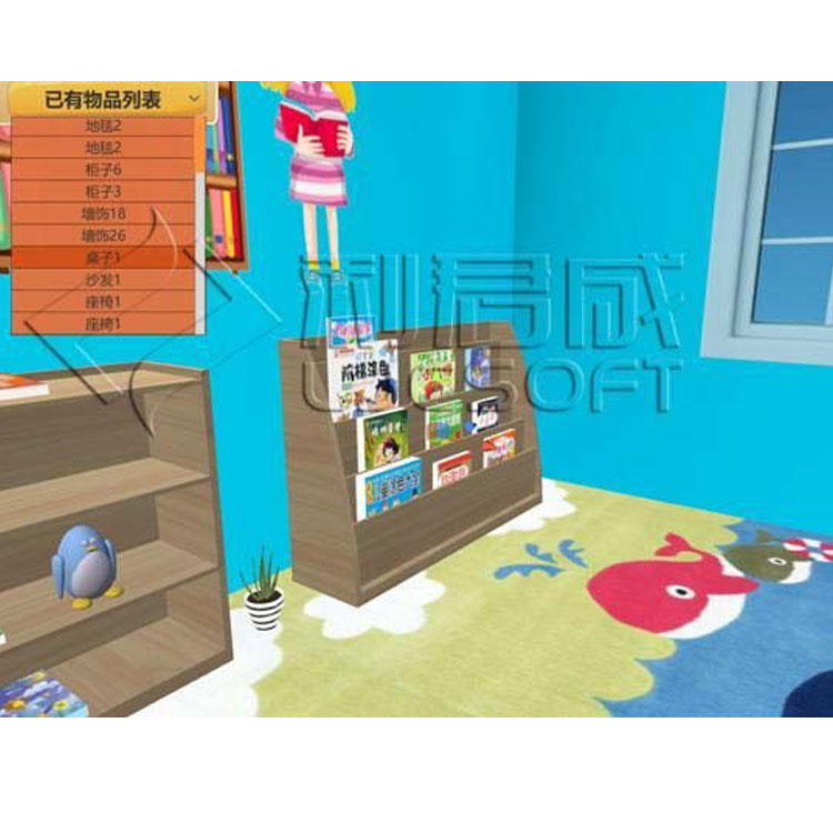 Preschool Basic Environment and Themed Design: Plan and arrange the preschool environment through a 3D interactive operation. The system can categorize and display items based on provided materials and features, such as dividing a classroom into language, science, art, intelligence, construction, and living areas, and then placing tables, stickers, educational toys, and other suitable items in each area. The system offers some design template examples for reference.