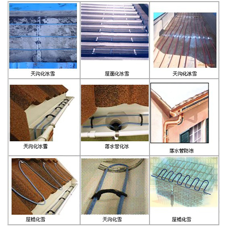 This system is suitable for various roof structures, preventing melted snow and ice from accumulating in gutters, and protecting the house facade and roof from damage caused by snow and ice. It can be used for melting snow and ice in drainage channels, roof gutters, and roof surfaces.
