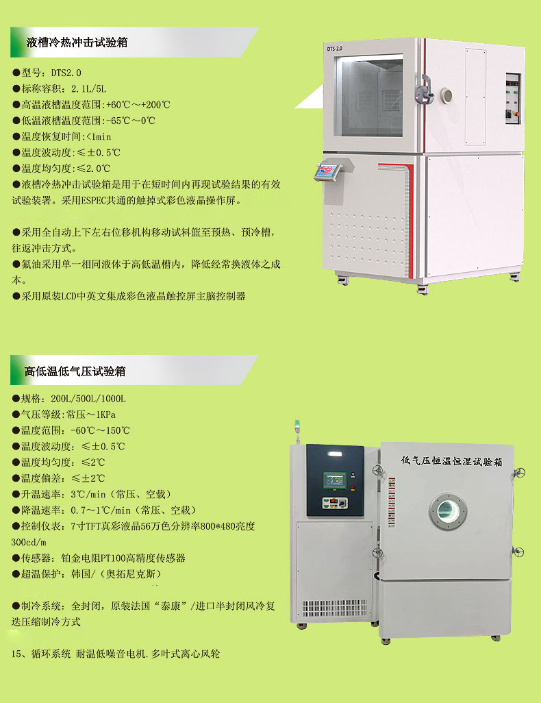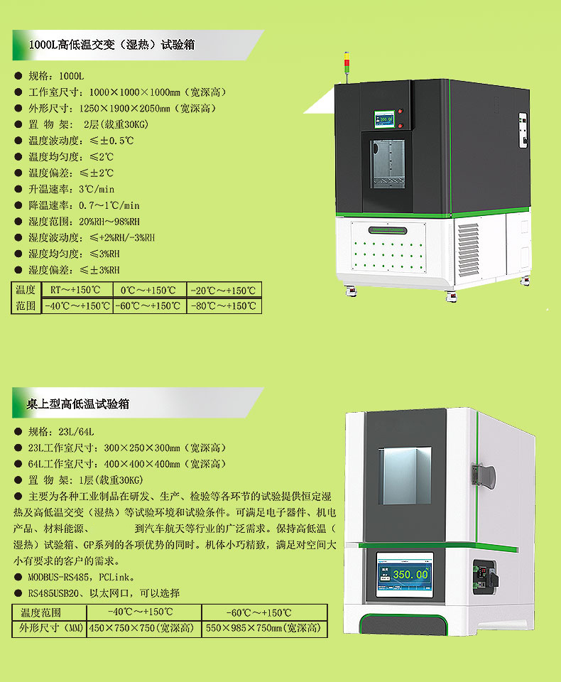 产品涉及恒温恒湿试验箱、高低温试验箱、高低温交变湿热试验箱、高低温冲击试验箱、超低温试验箱、氙灯耐候试验箱、甲醛释放舱、VOC释放舱、步入式高低温环境试验箱沙尘试验箱淋雨试验箱橡胶臭氧老化箱、耐老化试验系列、盐雾试验箱振动、跌落试验系列、电磁式振动试验台、模拟运输振动台、跌落试验台等几大类。