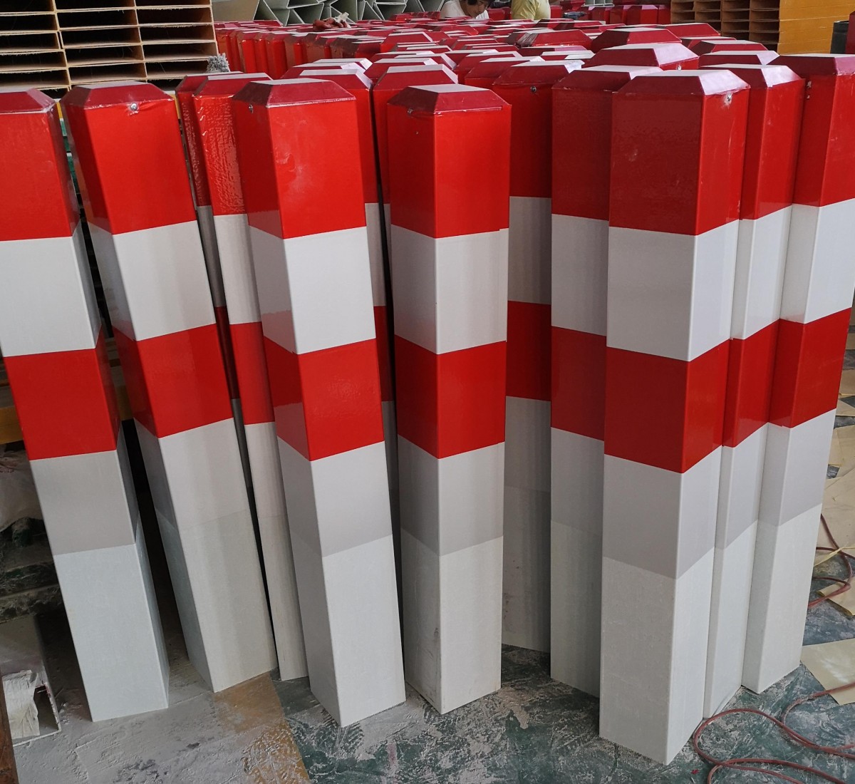 Glass fiber reinforced plastic (GFRP) sign posts are extruded from FRP profiles, utilizing glass fiber and its products as reinforcing materials, calcium powder as a filler, and synthetic resins as the matrix material, which are formed into a single piece through a GFRP extrusion machine.