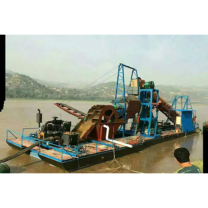 挖沙船是在河道里采沙的专用机器,由浮体浮起整体装置。配有挖掘装置、筛选装置、提升装置、传送装置等。通过动力装置驱动挖斗上料,石块通过筛选后由输送带传出,沙子由输送带传到地点。