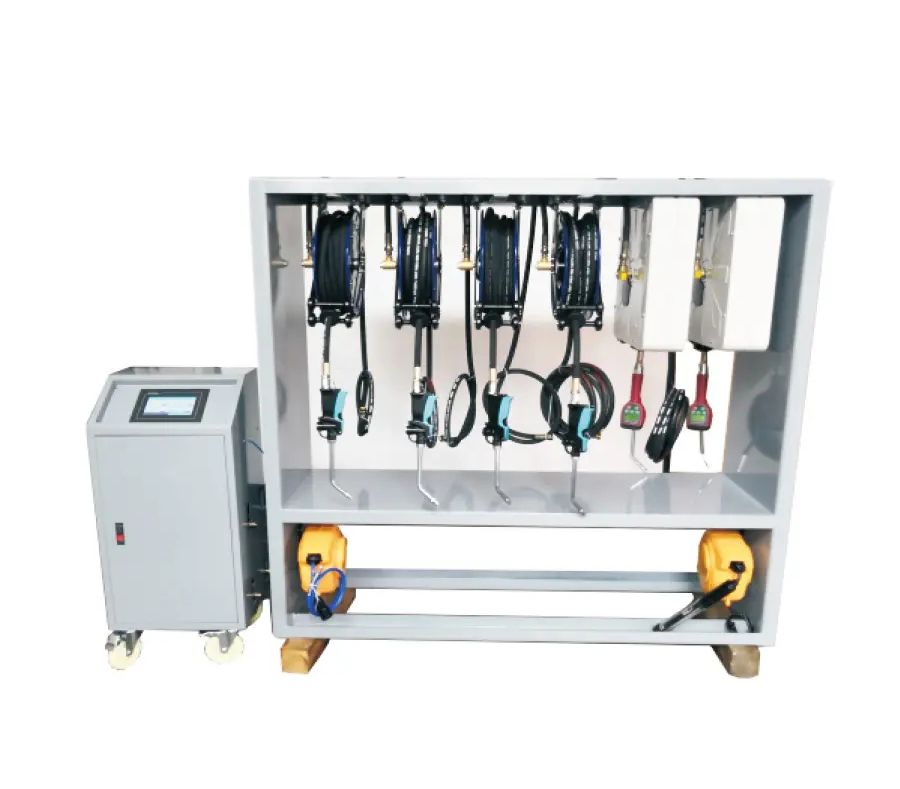 Oils are stored centrally in an oil storage facility or large oil drums, powered by an air-powered plunger pump. The lubricant is then transported through high-pressure hoses to the work shop, where multiple refueling stations are set up. At each station, an extendable automatic reel is installed for refueling.
