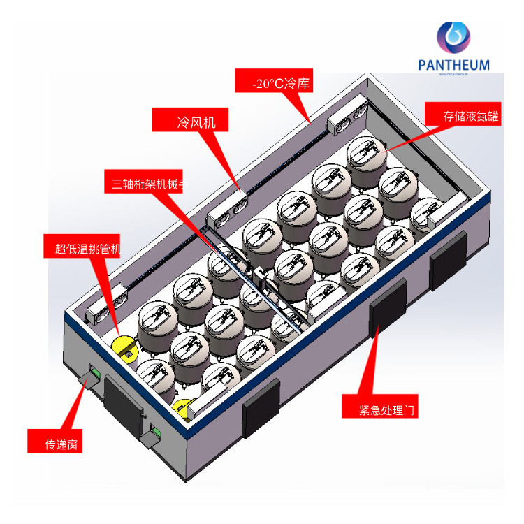 The Bio-Sample Storage Facility for Liquefied Nitrogen Tanks consists of multiple fully automatic gas phase liquefied nitrogen tanks, an automatic extraction crane for storage racks, an automatic pipette selector, an automatic box picking robot, an automatic transfer window, and transport tanks. It enables the fully automated in and out of storage for storage racks carrying frozen tubes.