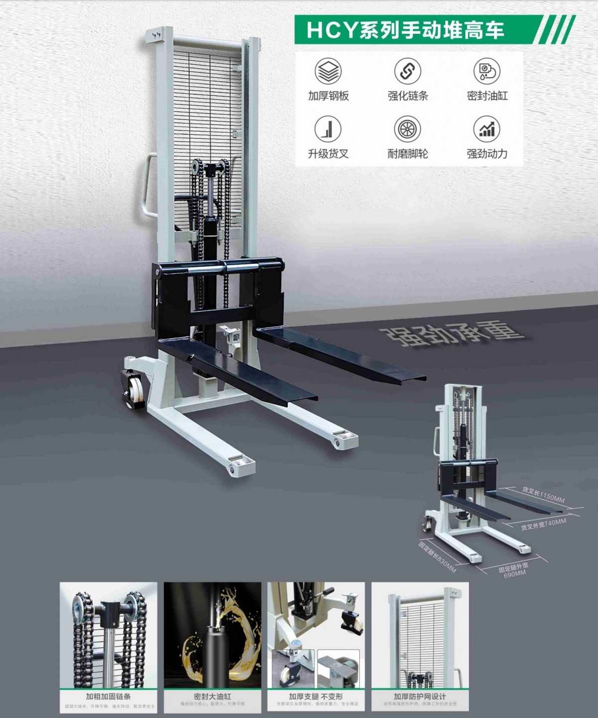 Manual forklift, upgraded forks, wear-resistant casters, powerful motor