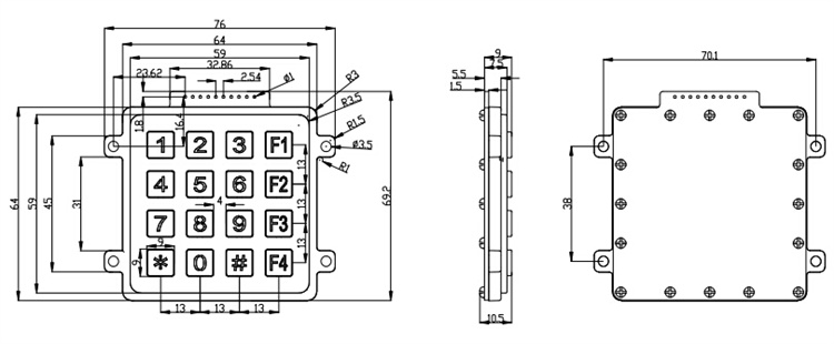 8.4" x 4" keyboard design, featuring 10 numeric keys and 6 function keys. The key layout can be redesigned according to customer requirements.