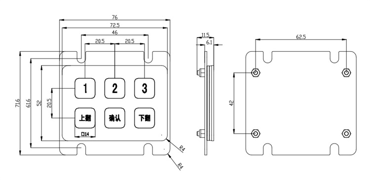 6.2x3 keyboard design, featuring 3 number keys and 3 function keys. The key layout can be redesigned according to customer requirements.