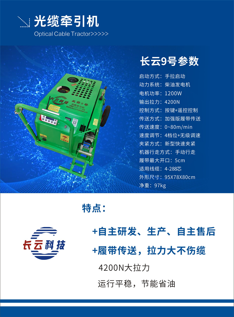 ●This machine features a compact and rational structure, excellent performance, smooth operation, ease of movement, fast conveyance speed, simple operation and maintenance, and ensures convenient and efficient cable construction. The new type of crawler conveyor has a strong pulling force, equivalent to the effort of about 5 people, significantly enhancing construction efficiency.