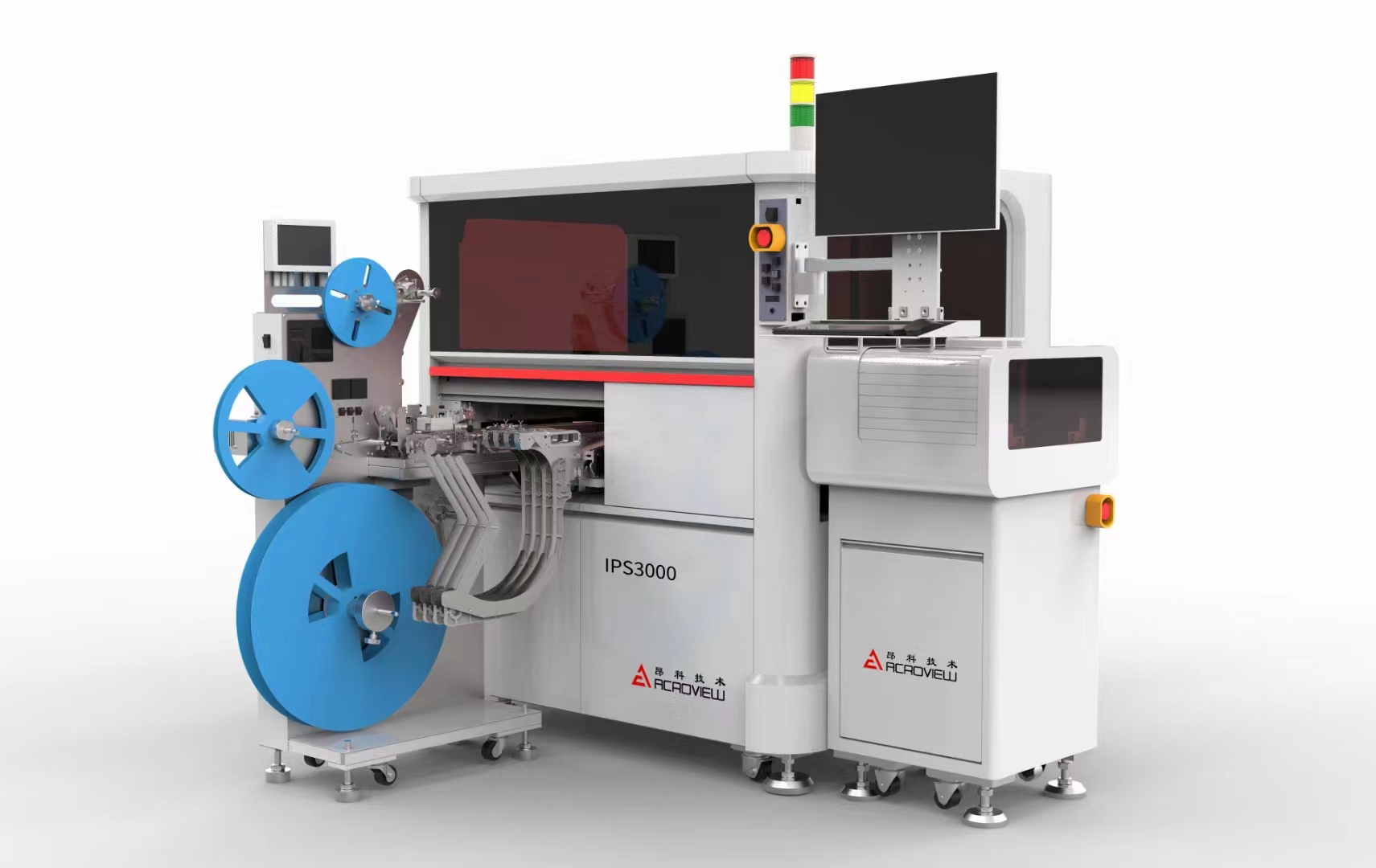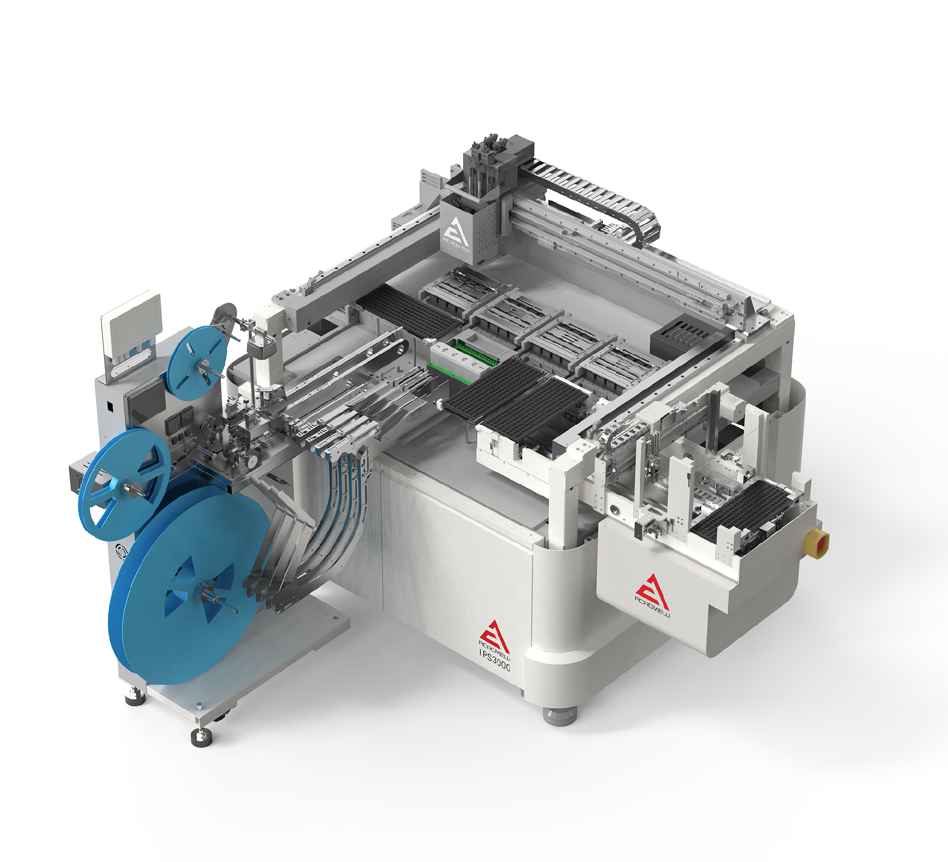 ● Two bottom cameras (1.3MP) with IC synchronized skew correction, and one top camera (1.3MP) for positioning at various work stations (including trays, material belts, burn-in seats, etc.).