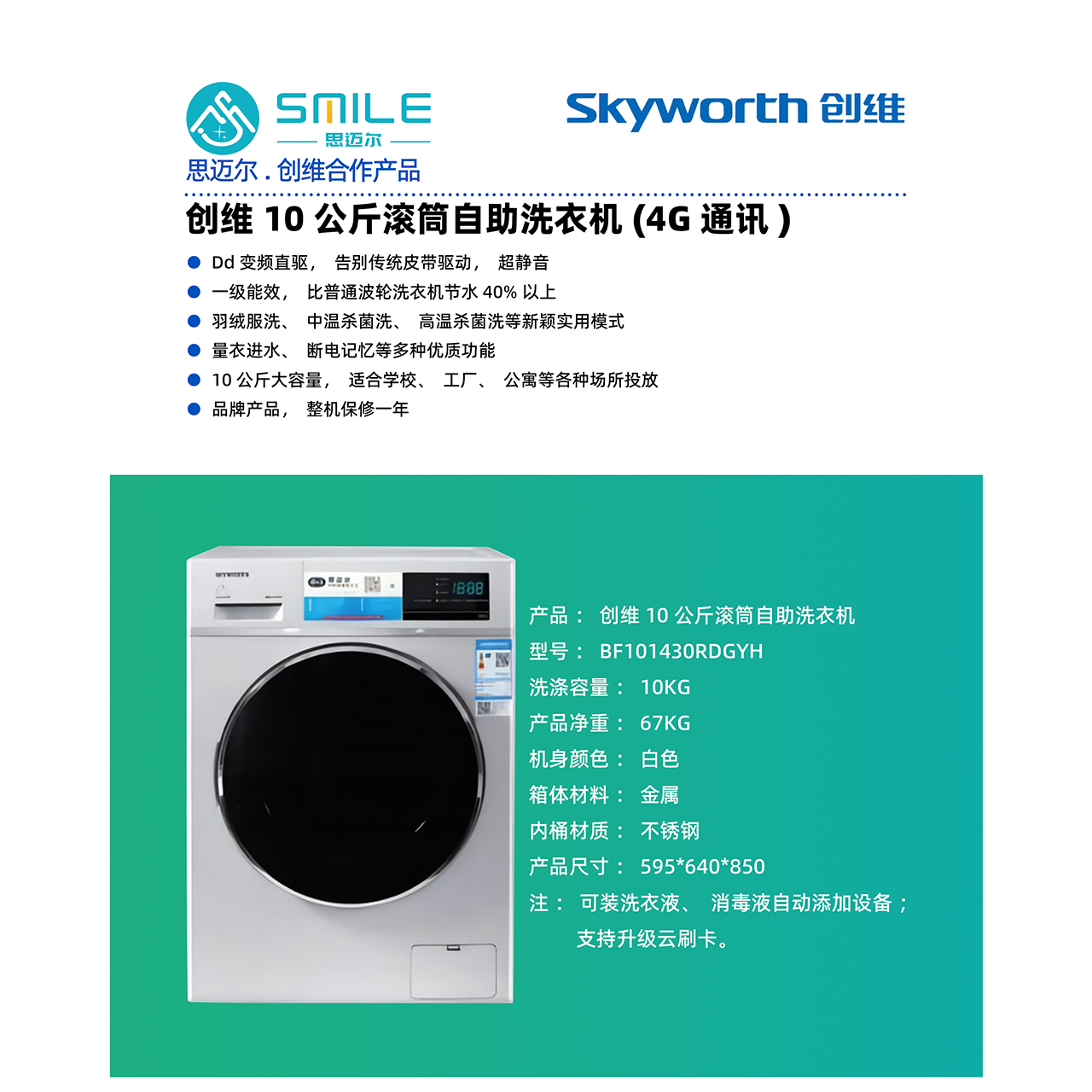 Smile has newly upgraded its models released in 2021, the Skyworth Top-Loading Washing Machine 10kg (10kg capacity), featuring large capacity, first-class energy efficiency, variable frequency direct drive, and an automatic detergent dispenser.